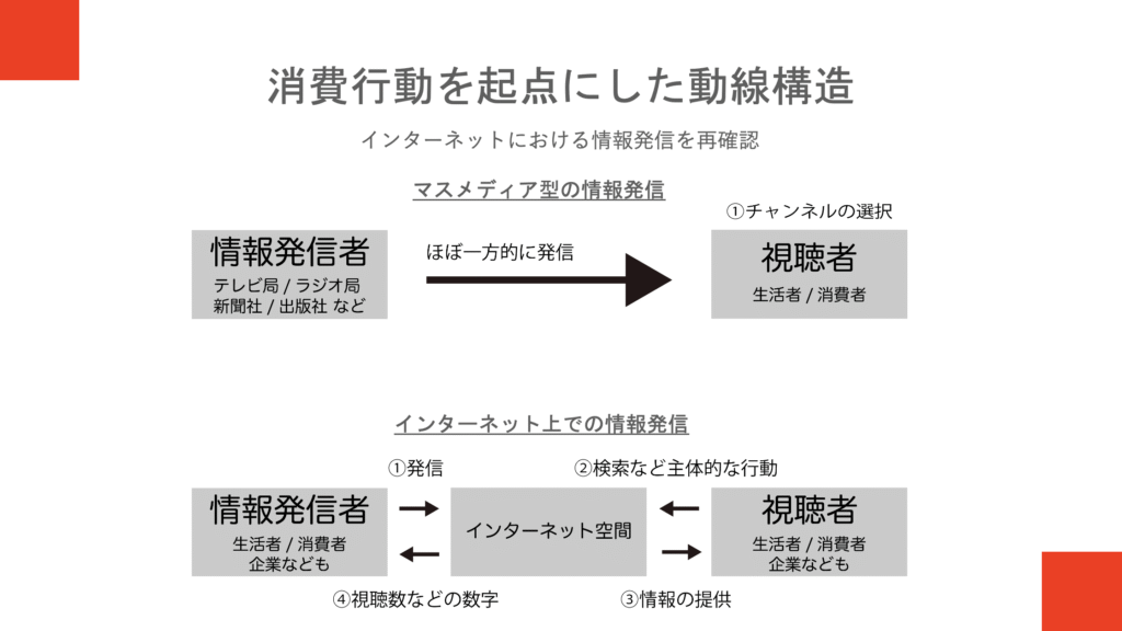下記の図をご覧ください。かつての「マスメディア型(上段)」は、企業が一方的に情報を浴びせる「雨」のような構造でした。ここでは「なんとなく知っている」状態を作れば勝ちでした。 しかし、現代の「インターネット型(下段)」は全く異なります。ここで起きているのは、一方的な放送ではなく、ユーザー自身が欲しい情報を能動的に取りに行く「探索」です。