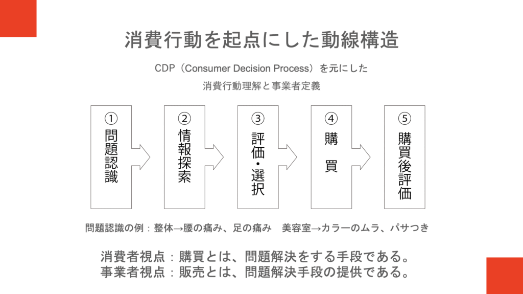 - 消費者視点: 購買とは、「抱えている問題を解決する手段」である。