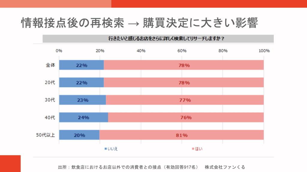 ある調査では、行きたい店を見つけた後に「さらに詳しく検索してリサーチしますか?」という問いに対し、約80%が「はい」と回答しています。 これは、顧客が「失敗したくない(=問題を確実に解決したい)」という強い防衛本能を持っているからです。