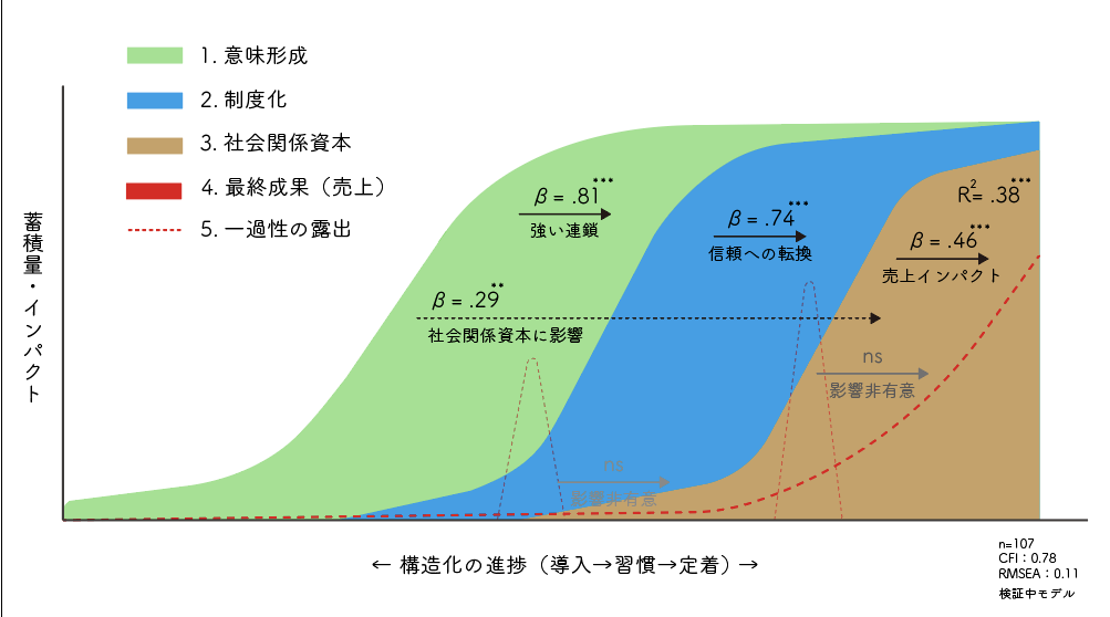 【グラフの注目点】 「社会関係資本(茶色の層)」の形成です 。この蓄積された信頼こそが、売上を動かす直接的なエンジン(β=.46)となります。一方で、グラフ上の「一過性の露出(赤い点線)」が示す通り、構造を伴わない単なる露出は、この蓄積ラインには乗りません。